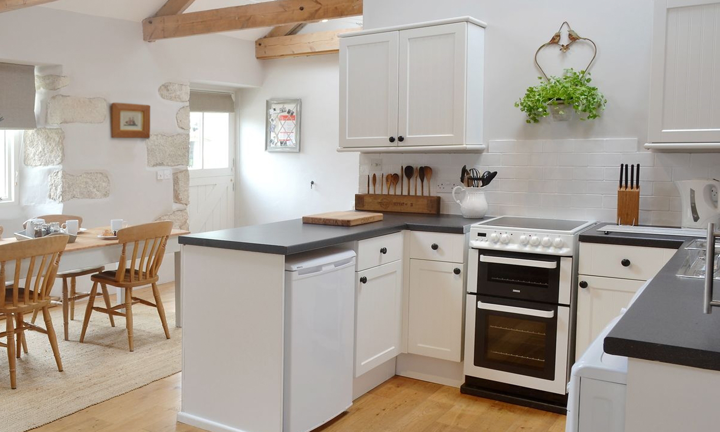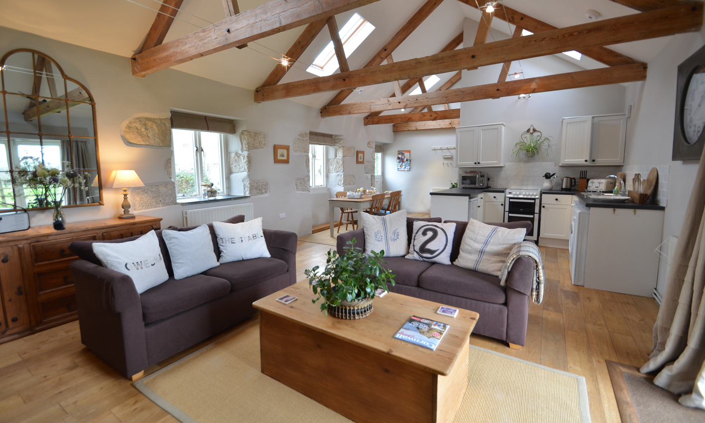 The Stable (TE1) is a traditionally constructed stone barn providing an open-plan living area which has been designed to take in the full height of the building with an exposed beams in a vaulted ceiling; with a Scandinavian log burner, and French doors leading out to its own garden with extensive countryside views. Perfectly placed to enjoy one of the magnificent Cornish sunsets.